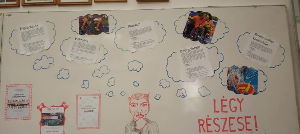 A képeken Dani Gyöngyi paralimpikon látható illetve az iskolai faliújságunk a Parasport Napjáról.